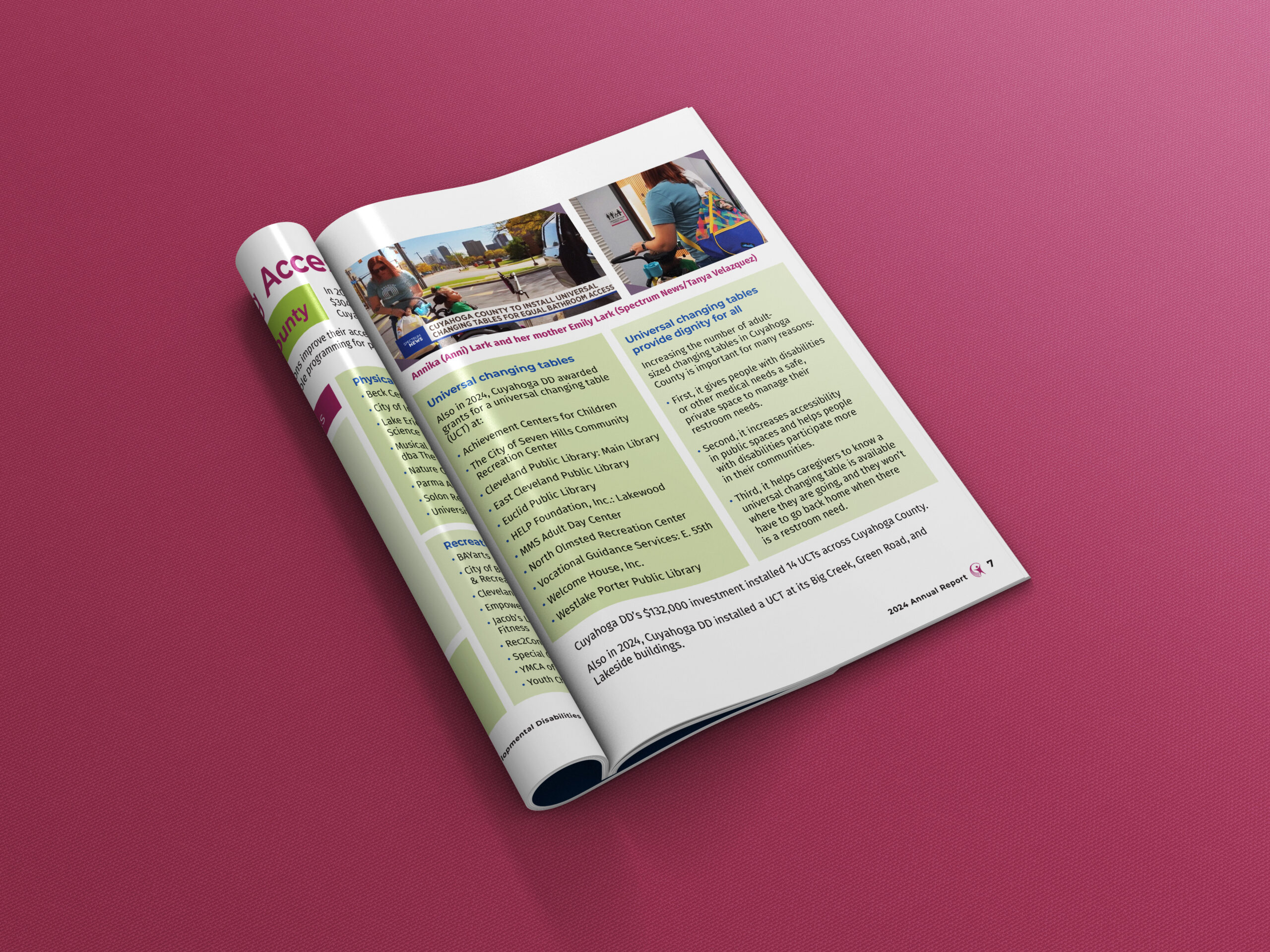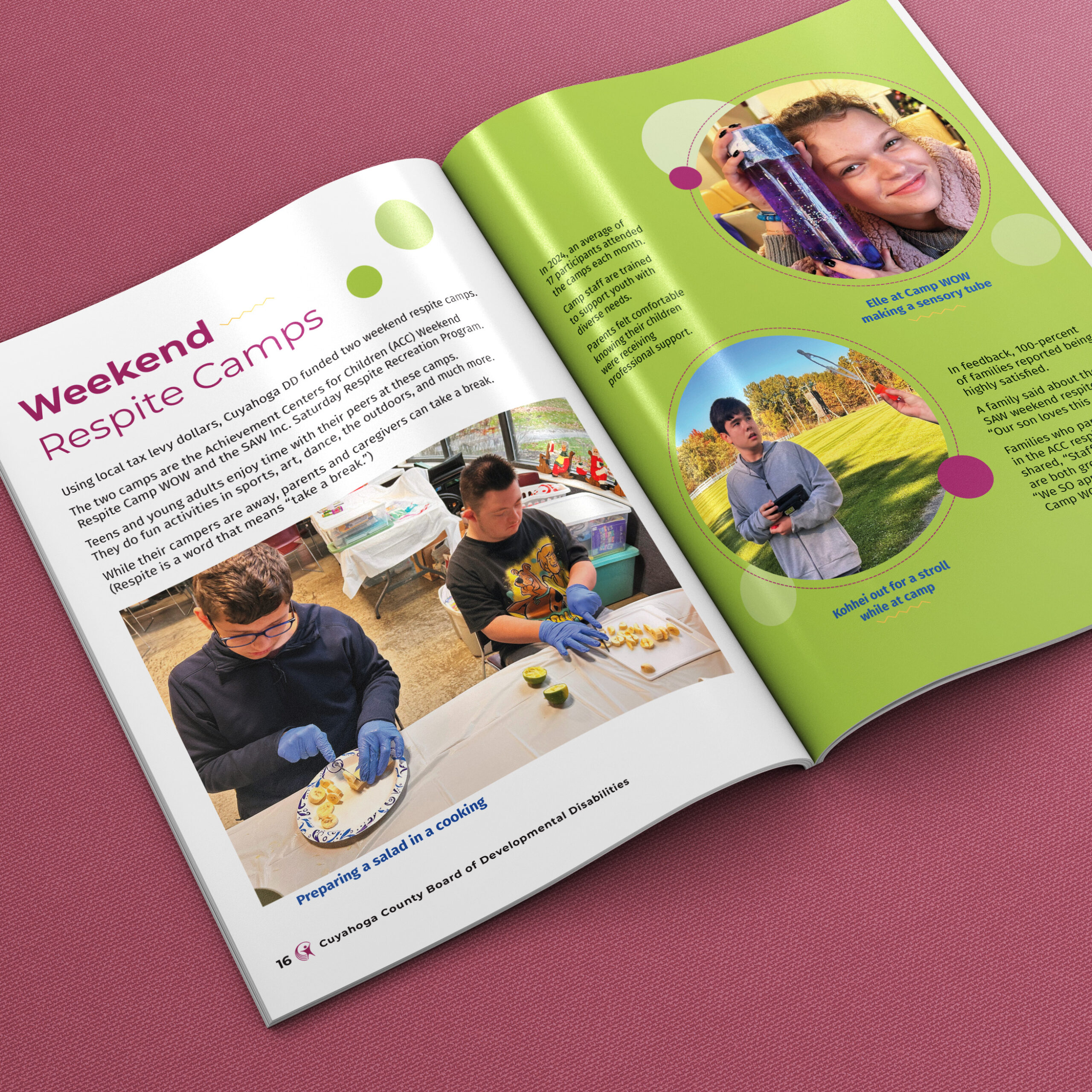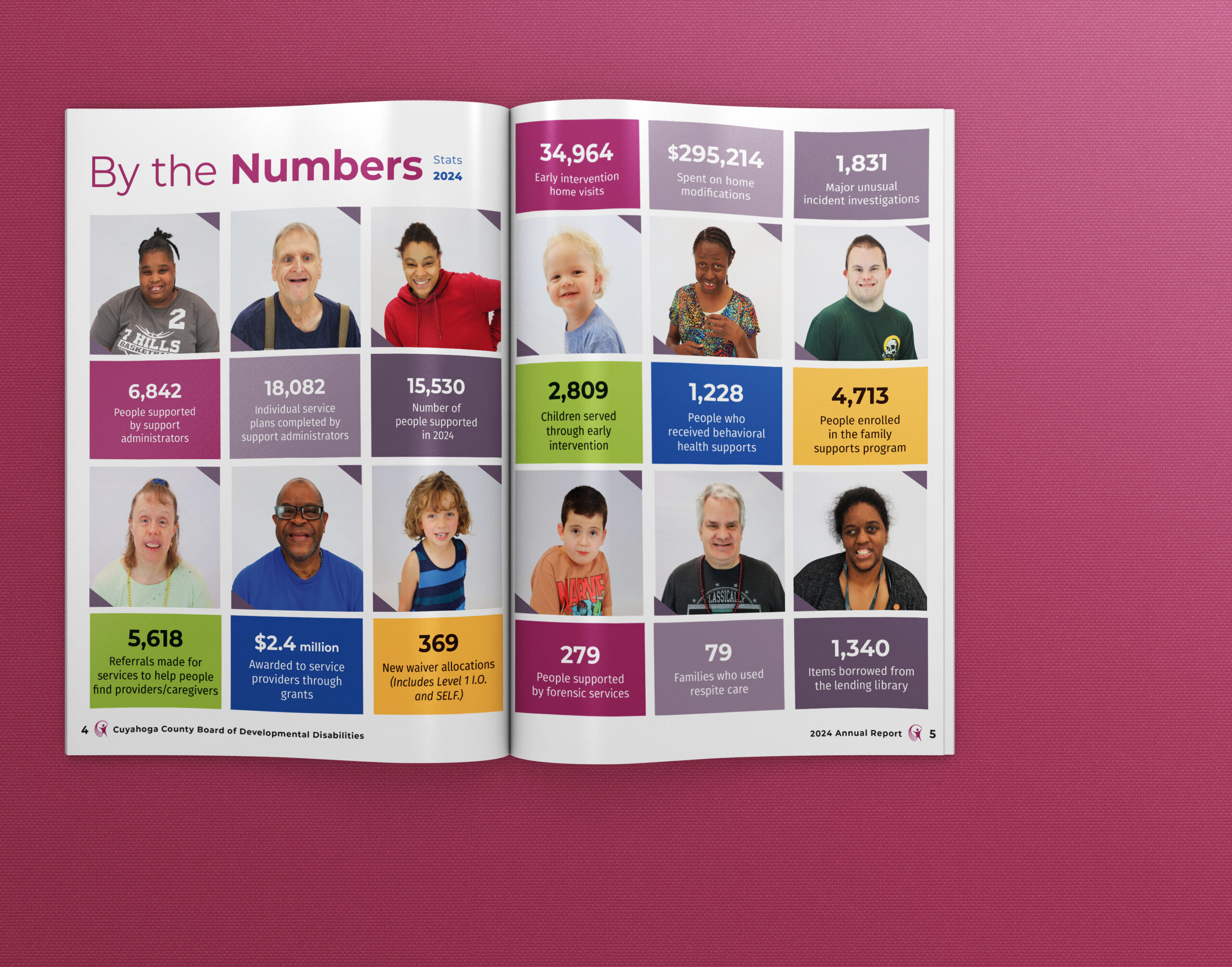 DesignLBS partnered with the Cuyahoga County Board of Developmental Disabilities to design their 2024 Annual Report — a publication that reflects both the organization’s impact and its deep commitment to inclusion, accessibility, and community. Our team developed a visually engaging and easy-to-navigate layout that highlights key achievements, data insights, and personal stories in a way that is both informative and human-centered, written for the age range 12 and up. From typography to color palette, every design choice was made with accessibility in mind, ensuring the report could be enjoyed and understood by a diverse audience. This project exemplifies our approach to meaningful design — where storytelling and function work hand-in-hand to elevate the mission of our clients.